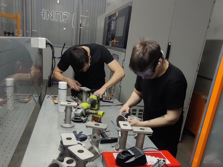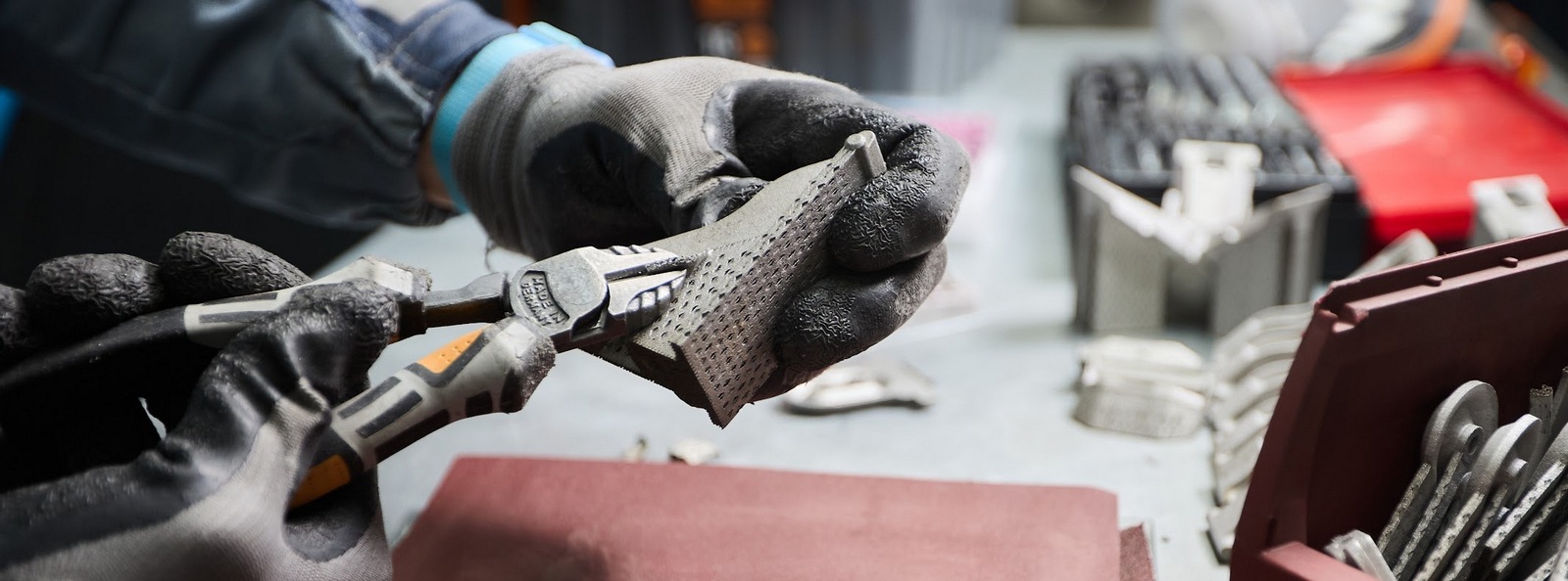 Затем удаляются поддержки — это кропотливый процесс, требующий опыта, чтобы не оставить следов на поверхности. На снимке показан процесс снятия поддержек: мастер использует ручной инструмент, чтобы аккуратно убрать лишний металл.